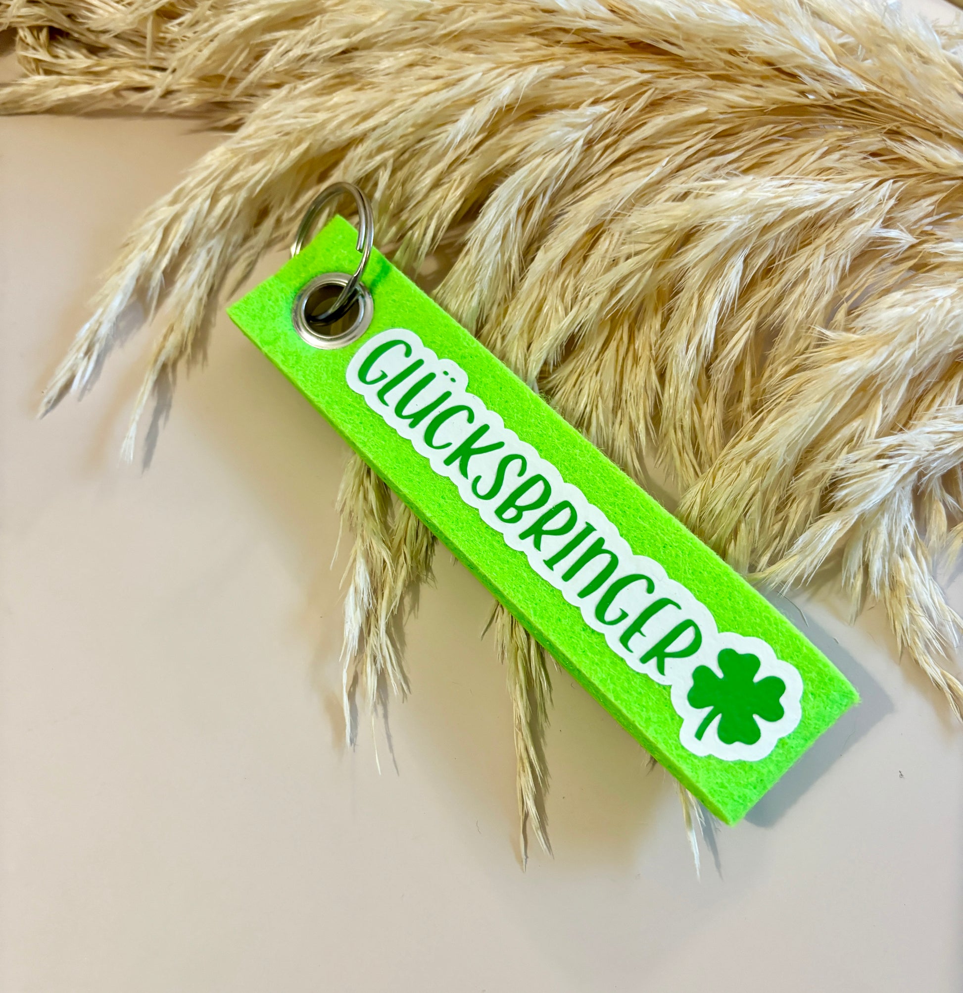 Bringen Sie Glück in Ihr Leben mit diesem farbenfrohen Schlüsselanhänger aus Filz. Der leuchtend grüne Anhänger mit der Aufschrift “Glücksbringer” und einem charmanten Kleeblatt-Motiv ist das perfekte Accessoire für positive Vibes.